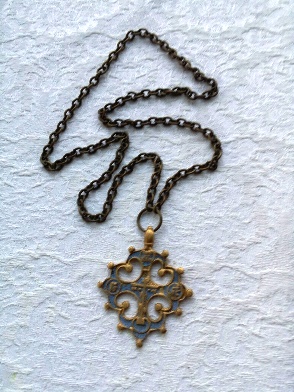 Kerran mie mänin yštävän kera jarmankkah, missä kaupittih monenmoista ilmanikuista tavarua. Miun yštävän sussieta oli niise myöjänä jarmankalla. Konša mie nävin tämän kuvašša olijan kaklarissin hänen stolaššah, niin tiesin paikalla, jotta miun on pakko šuaha tuo vanha vienalaini risti. Še on krassittu šinisellä kraskalla. Šanotah, jotta starovierat käytettih šinisellä krassittuja vaškioprasoja ta vaškiristijä. Meijän muamon heimolaiset on oltu starovieroja. Šentäh tämä kaklaristi tuntu tärkieltä šuaha.