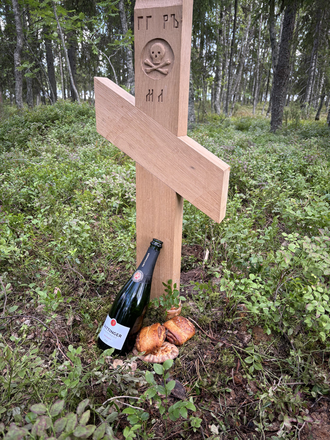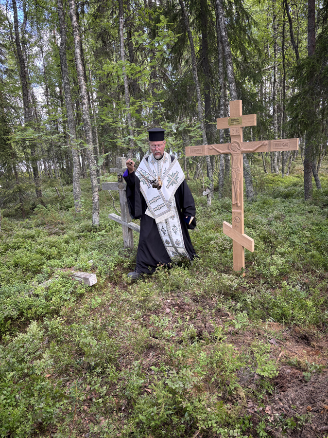 Haudalla oli tapana jakaa Jumalan hyvie, eli leipää tai muuta pientä tarjottavaa. Piispa Arseni kertoo, että hautaristiin kaiverrettu ylin kirjainrivi GG= gora, joka tarkoittaa Golgofaa eli Golgatan kalliota. Seuraavat kaksi RB= Raj byt merkitsevät: oli Paratiisi. Niiden alle on kaiverrettu Aadamin kallo ja sääriluut. Alinna kirjaimet ML= mesto lobnoe tarkoittavat pääkallon paikkaa. Nämä viittaavat Kristuksen ristiinnaulitsemiseen Golgatalla ja syntiinlankeemuksessa kadotettuun Paratiisiin. Kuva: Jonna Rantala