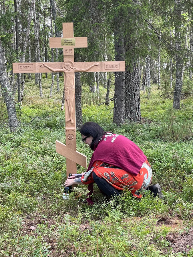 Tätini hautapaikka oli valmiiksi kaivettu, kuten tapana oli. Me läheiset heitimme hautaan ensin kuparikolikot, ja sen jälkeen loimme haudan umpeen. Kun hauta oli peitetty, vainajan jalkopuoleen pystytettiin puusta veistetty risti. Puinen maja, kropnitša, rakennettiin myöhemmin.