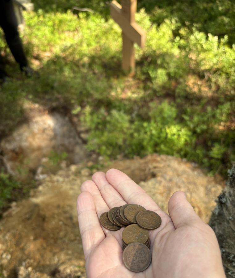Mukaan laitettiin myös kuparikolikko, jonka tarkoitus oli lunastaa vainajalle oma koti. Kuva: Jonna Rantala