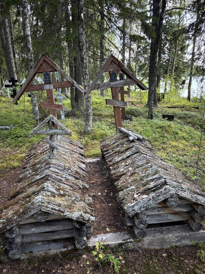 Kuivajärven kalmosaaressa kaksi kaunista kropnitšaa, vainajien viimeistä asuinsijaa, saavat karjalaiseen tapaan maatua luonnollisesti. Kuva: Jonna Rantala