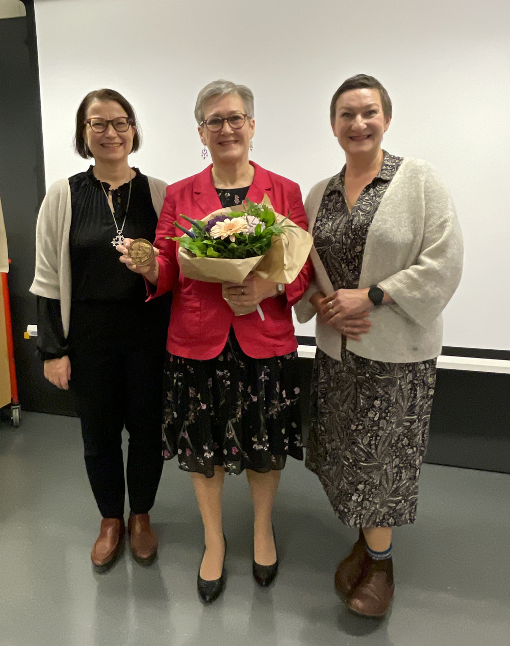 Leena Joki (keskellä) Karjalan Sivistysseuran hallituksen jäsenen Mari Rajamaan (vas.) ja toiminnanjohtajan Eila Stepanovan (oik) kanssa. Kuva: Lotta Jalava, Kotus.