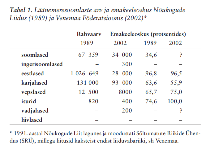 Neuvostoajan voidaan kielellisesti katsoa vaikuttaneen virolaisiin ja karjalaisiin eri tavalla – olivathan kansojen ja kielten lähtökohdat hyvin erilaiset. Virolaisilla oli taustallaan itsenäisyys, jota ennen ja jonka aikana viron kieltä oli kehitetty ja vaalittu kansallisena kielenä, millä on oletettavasti ollut vahvistava vaikutus virolaiselle identiteetille ja virolaisten yhtenäisyydelle. Sitä paitsi viro säilyi virallisena kielenä koko neuvostoajan. Karjalaisilla tällaista kansallisen ja kielellisen yhtenäisyyden kokemusta ei ollut, ainakaan laajalla mittapuulla. Taustalla pikemminkin painoivat sekä suomalaistaminen että venäläistäminen. Tämän pohjalta ei olekaan ehkä yllättävää, että Neuvostoliitossa vuonna 1989 väestönlaskennan mukaan 95,5 % virolaisista puhui viroa äidinkielenään, kun taas karjalaisista vain 50,1 % puhui karjalaa (Õispuu 2002).