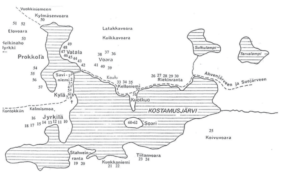 “Vuuvven 1678–1679 lašentakirjan mukah Koštamukšen (Kostomozerskaja) 12 talošša eli 18 aikuhista mieštä ta 10 poikua. Kylä kuulu šilloin Kuolan läänin Repol’an volostin Roukkulan nellännekšeh.