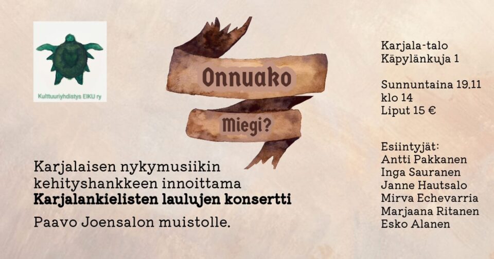 Karjalatalon juhlasalissa sunnuntaina 19.11. soivat karjalankieliset laulut klo 14 alkavassa konsertissa. Konsertti liittyy Karjalan Sivistysseuran rahoittamaan projektiin ”Onnuako miegi, karjalankielisen tämän päivän laulumusiikin kehittämishanke”.