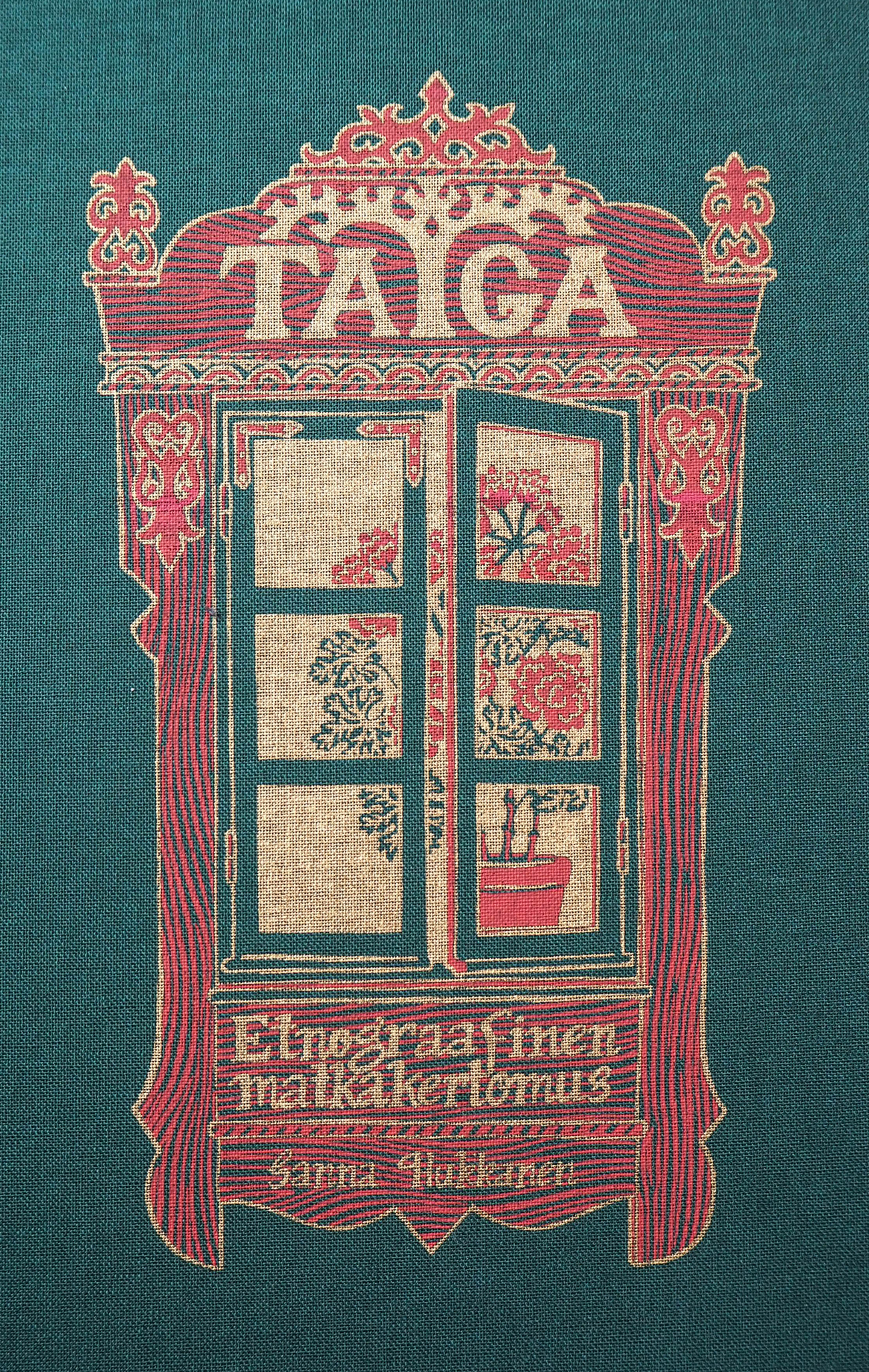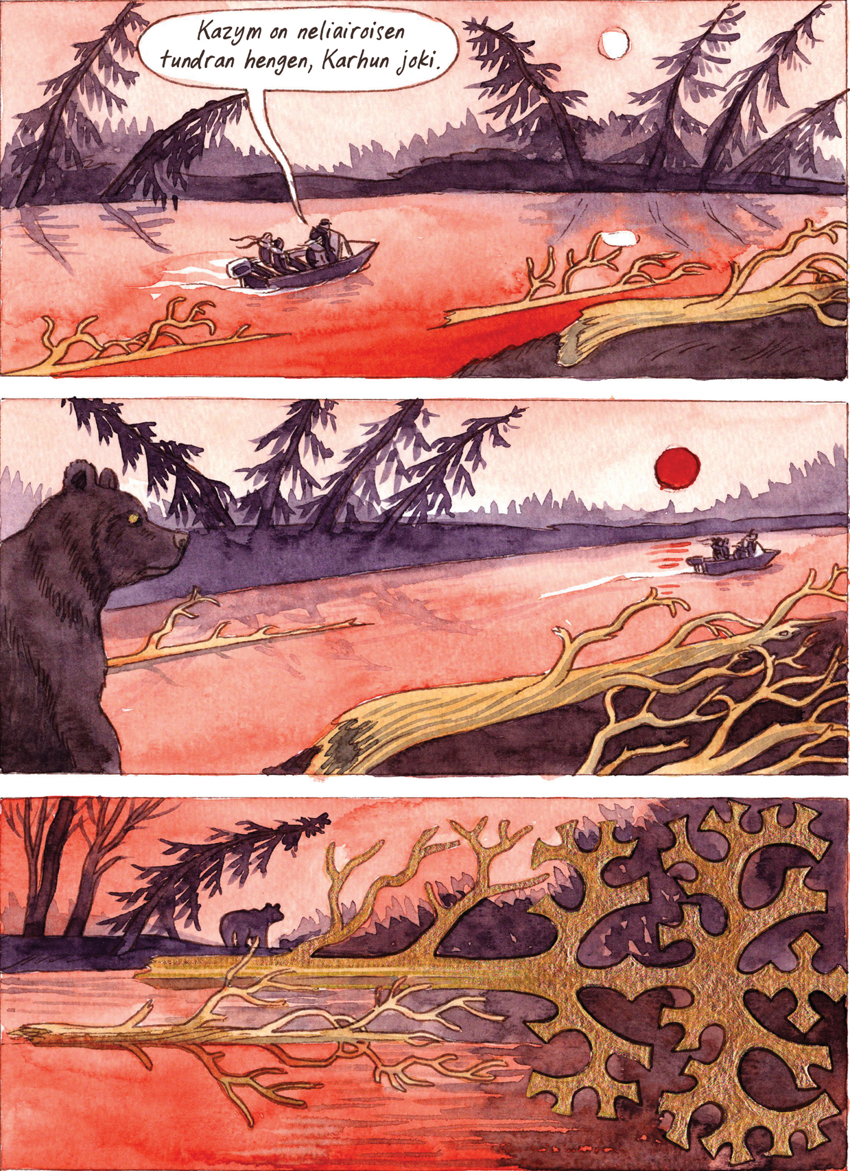 Kangaspinta ja kulta luovat kirjankanteen syvyyttä Sanna Hukkasen teoksessa Taiga – EtnoGraafinen matkakertomus (Täysi Käsi Oy, Zum Teufel, Umpihanki 2023, 280 sivua).