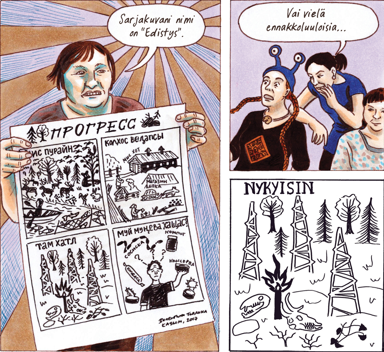 Hanti-Mansian Kazymissa työpajaan osallistuneiden iäkkäiden naisten sarjakuvat olivat rohkeita.