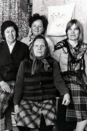 Foto: J. Surhasko. Instituutan tutkijat piettih yhtevytty tundiettuloin runonpajattajienke da heijän omahizienke. Kuva luajittih vuvvennu 1988, tagariävys ollah tutkijat Santra Stepanova, Tatjana Sen’kina da Raisa Remšujeva. Enziriävys on runonpajattajan Anastasija Nikiforovan tytär.
